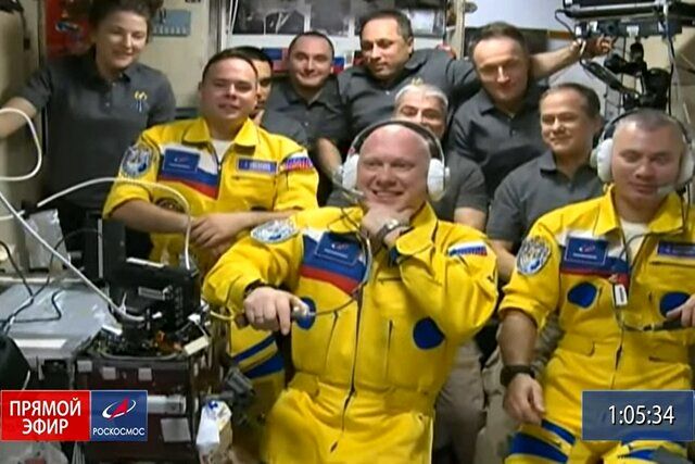 اقدام عجیب فضانوردان روس / با لباسی به رنگ پرچم اوکراین به زمین بازگشتند!