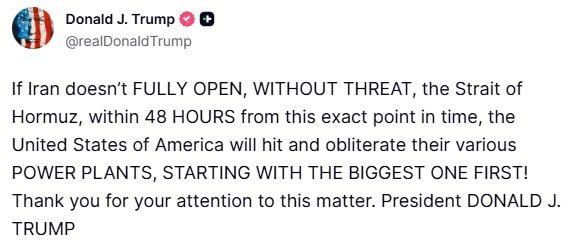 اگر ایران ظرف ۴۸ ساعت از همین لحظه تنگه هرمز را بهطور کامل و بدون تهدید باز نکند، ایالات متحده آمریکا به نیروگاههای مختلف آنها حمله کرده و آنها را از بین خواهد برد، و ابتدا از بزرگترین آنها شروع خواهد کرد.
