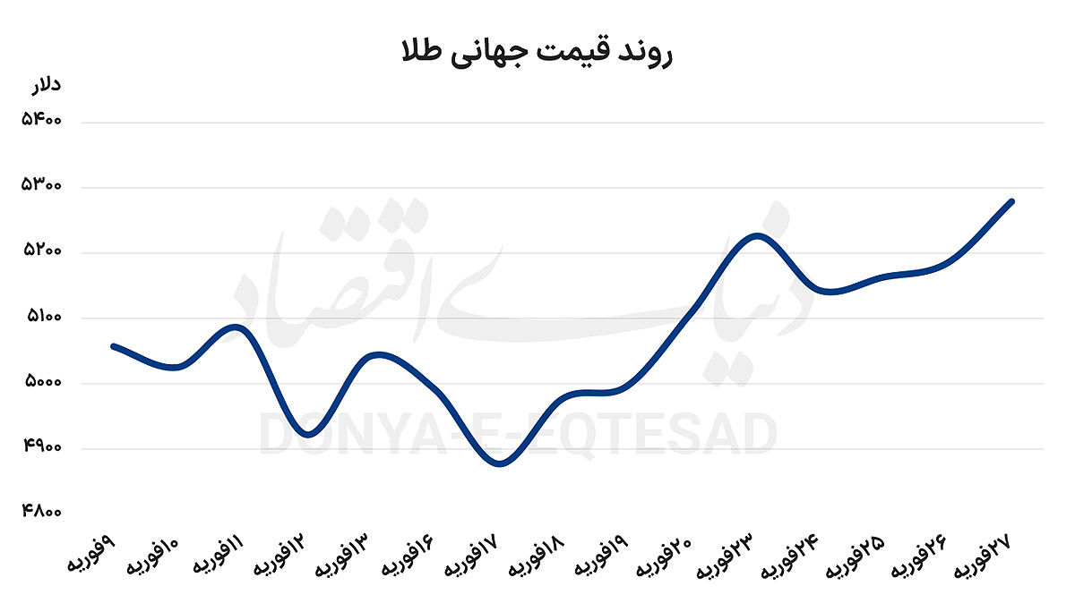 در ساعات پایانی هفته معاملاتی بازارهای جهانی، قیمت هر اونس طلای جهانی با قیمتی معادل ۵۲۷۹ دلاری بسته شد. این اوجگیری قیمت، در همزمانی تقریبی با پایان مذاکرات دیپلماتیک بین ایران آمریکا رخ داد. ساعاتی پس از تعطیلی بازارها، بین ایران، اسرائیل و آمریکا، تبادل موشک شکل گرفت. تجارب قبلی نیز نشان میدهد که اینگونه حملات، در زمان تعطیلی بازارهای جهانی رخ میدهد تا زیان وارده به بازارها به حداقل برسد.