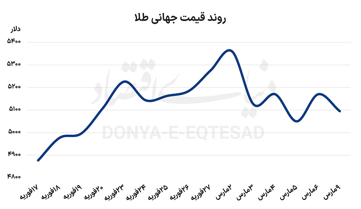 پس از وارد شدن شوک جنگ به بازارها، قیمت هر اونس طلا در اولین جلسه معاملاتی بعد از جنگ، با جهشی ناگهانی به بالای سطح ۵۴۰۰ دلاری رسید. با این حال، پس از تخلیه هیجانات از بازار و افزایش انتظارات تورمی ناشی از جهش قیمت انرژی، معاملات طلا به سطوح قبل از جنگ بازگشت. اگرچه طلا می‌تواند به‌عنوان سپر تورمی عمل کند، اما افزایش احتمال توقف سیاست‌های پولی انبساطی برای کنترل تورم، به روند نزولی طلا دامن زد.