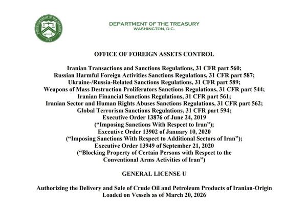 وزارت خزانهداری ایالات متحده یک مجوز عمومی جدید مرتبط با ایران صادر کرده است که اجازه فروش نفت خام و فرآوردههای نفتی ایران را که از ۲۰ مارس در کشتیها بارگیری شدهاند، میدهد. این مجوز تا ۱۹ آوریل (اواخر فروردین) معتبر است.