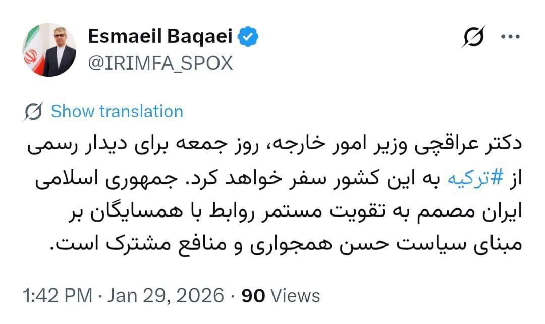 دکتر عراقچی وزیر امور خارجه، روز جمعه برای دیدار رسمی از ترکیه به این کشور سفر خواهد کرد. جمهوری اسلامی ایران مصمم به تقویت مستمر روابط با همسایگان بر مبنای سیاست حسن همجواری و منافع مشترک است».