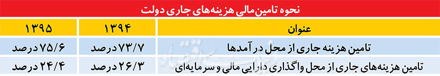 در بخش هزینهها (از محل منابع عمومی دولت) مبلغ 8/ 3073 هزار میلیارد ریال بابت مصارف سال 1395 پیشبینی شده است که نسبت به سال قبل 12 درصد افزایش یافته است. بیش از 64 درصد (8/ 1971 هزار میلیارد ریال) از مصارف بودجه عمومی دولت مربوط به هزینههای جاری و نزدیک به 597 هزار میلیارد ریال (4/ 19 درصد) مربوط به هزینههای سرمایهگذاری است. نحوه تامین مالی هزینههای جاری دولت در حسابهای منابع عمومی در سالهای 1394 و 1395 به این شرح است.