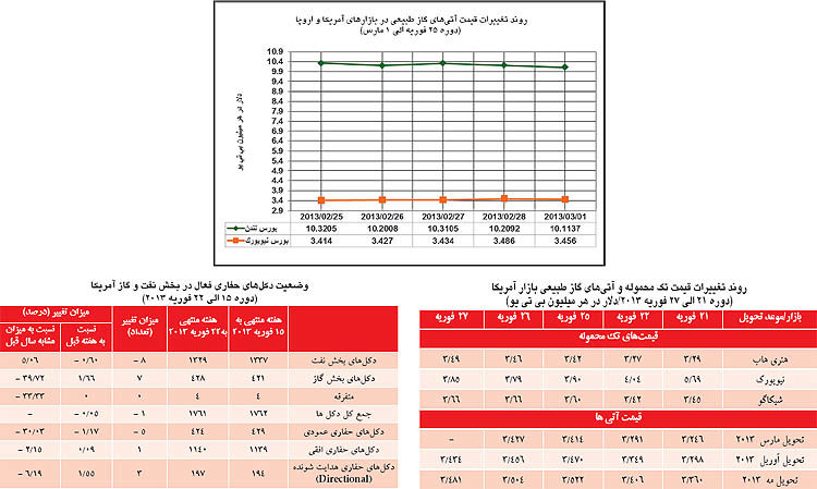 ۲۲ فوریه، به دلیل کاهش تولید گاز طبیعی معادل ۴۹/۰ درصد در هفته منتهی به۲۷ فوریه ۲۰۱۳ و همچنین کاهش سطح ذخایر زیر زمینی عملیاتی گاز طبیعی آن معادل ۱۷۱ میلیارد فوت مکعب طی هفته منتهی به۲۲ فوریه، عمدتا از یک روند افزایشی برخوردار بود. بر این اساس، قیمت تک محموله گاز طبیعی در بازار هنری هاب از یک روند افزایشی همراه با نوسان برخوردار بوده و از ۲۹/۳ دلار در تاریخ ۲۱ فوریه، با ۲۰ سنت (۰۸/۶ درصد) افزایش تا بیش از ۴۹/۳ دلار در هر میلیون بی تی یو در تاریخ ۲۷ فوریه افزایش یافت. قیمت تک محموله گازطبیعی در بازار شیکاگو نیز طی دوره مذکور از یک روند افزایشی همراه با نوسان برخوردار بوده و از ۴۵/۳ دلار تا بیش از ۶۶/۳ دلار افزایش یافت. از سوی دیگر، قیمت تک محموله گاز طبیعی در بازار نیویورک از یک روند کاهشی برخوردار بوده و از ۶۹/۵ دلار در هر میلیون بی تی یو در تاریخ۲۱ فوریه، با ۸۴/۱ دلار (۳۳/۳۲ درصد) کاهش تا کمتر از ۸۵/۳ دلار در هر میلیون بی تی یو در تاریخ ۲۷ فوریه کاهش یافت.