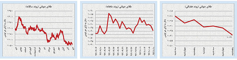 اونس طلای جهانی در آخرین هفته سال ۲۰۱۵ با افت ۴/ ۱ درصدی همراه شد تا در مجموع با افت ۳/ ۱۰ درصدی سومین سال منفی را سپری کند. هفته گذشته، شاهد کاهش حجم معاملات اونس بودیم. در سال گذشته، سیاستگذاری پولی متفاوت فدرال رزرو و سایر بانکهای مرکزی، رشد ۹ درصدی شاخص دلار را رقم زد. در سال جاری نیز، روند افزایش نرخ بهره توسط فدرال رزرو میتواند بر اونس تاثیرگذار باشد. همچنین با اینکه آمارها حاکی از افزایش تقاضای فیزیکی طلای آسیای شرقی است، اما تقاضای فیزیکی نتوانسته است در مقابل فشار شاخص دلار از اونس حمایت کند. در هفته جاری، صورتجلسه نشست فدرال رزرو، آمار اشتغال و شاخص خرید مدیران کارخانهای این کشور میتوانند بر اونس تاثیرگذار باشند. ارتباط مستقیم میان سرعت بهبود اقتصاد آمریکا و افزایش نرخ بهره، نقش آمارهای اقتصادی را برای معاملهگران طلا افزایش میدهد.